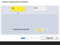 Carregue em <Ligado> para <Usar autent. utilizador>, carregue em <Ligado> para o método de início de sessão a utilizar, e carregue em <Seguinte>.