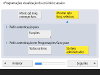 Selecione a duração de tempo para apresentar o ecrã de início de sessão. Se selecionar <Mostrar qdo funç. selecion.>, carregue em <Funções>, selecione a função cujo ecrã de início de sessão pretende visualizar e carregue em <OK>. Além disso, selecione os itens de programações no ecrã <Programações/Grav.> cujo ecrã de início de sessão pretende visualizar.