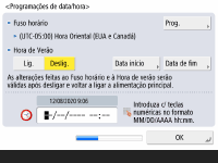 Programe <Fuso horário> e <Hora de Verão>, conforme for necessário. Para mais informações, consulte Acertar a data/hora.