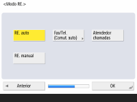 Carregue em <RE. auto> quando utilizar apenas a função de fax ou <Fax/Tel. (Comut. auto)> quando estiver ligado à máquina um telefone ou um auscultador e carregue em <OK>.