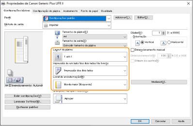 Enquanto verifica o ecrã de pré-visualização, programe [Layout da página] [Ordem das páginas] [Impressão de um lado/dos dois lados/de livreto] [Local de encadernação].