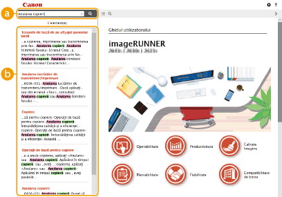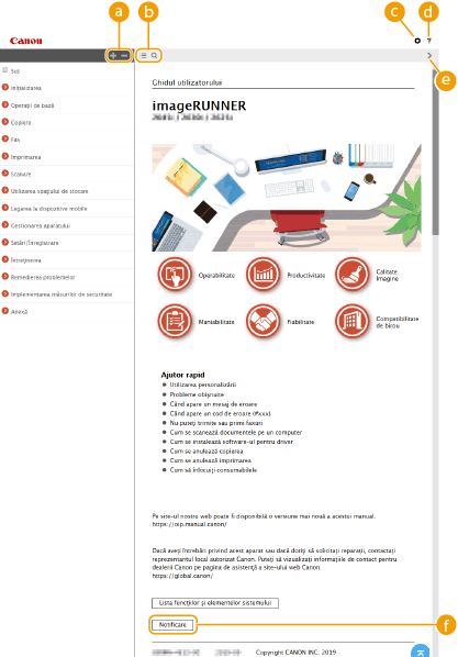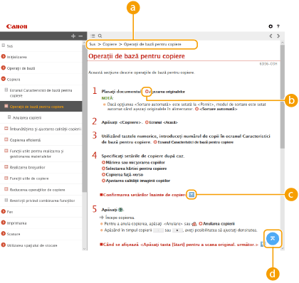 Faceți clic pentru a afișa informațiile despre cum să vizualizați Ghidul utilizatorului, cum să realizați o căutare și alte informații.