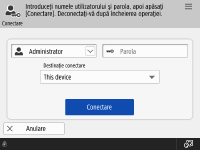 Când se afișează ecranul de conectare, utilizatorii autorizați înregistrați trebuie să se conecteze pentru a continua să opereze aparatul. Pentru a se conecta, fiecare utilizator trebuie să introducă numele de utilizator propriu și parola proprie. Astfel se asigură securitatea aparatului. De asemenea, utilizatorii pot folosi aparatul cât mai comod posibil, personalizând afișajul și setările conform preferințelor lor. Elementele afișate în ecranul de conectare diferă în funcție de setările de gestionare ale utilizatorului. Efectuați operația de conectare pe baza articolelor afișate.