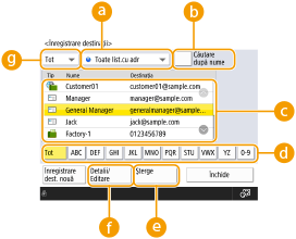 Selectați (e-mail), (fax), (I-fax), (fișier) sau  (grup) pentru a filtra destinațiile afișate în lista de destinații (). Apăsați <Tot> pentru a afișa toate destinațiile înregistrate.