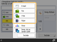 Destinațiile înregistrate în butoanele rapide pot fi combinate într-un grup și înregistrate ca o singură destinație. Pentru detalii, consultați Înregistrarea unui grup într-un buton rapid.