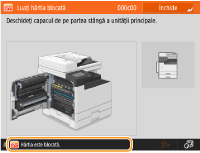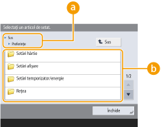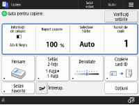 Aveți posibilitatea să modificați setările referitoare la afișarea pe ecran, cum ar fi alegerea ecranului care apare imediat după pornirea aparatului sau dacă mesajul care se afișează se referă la volumul rămas de hârtie sau de toner. <Setări afişare>