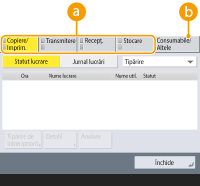 (Monitor Statut), se afișează ecranul <Monitor Statut>. În acest ecran puteți verifica starea imprimării și starea transmisiei, precum și volumul de toner rămas și nivelul memoriei.