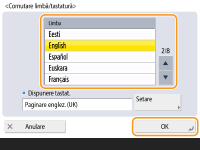 Dacă ați setat pe <Pornit>,  apare în partea de jos a afișajului panoului tactil. Puteți comuta limba afișată curent cu o altă limbă apăsând butonul <Comutare limbă/tastatură>, selectând limba dorită din listă și apăsând <OK>.