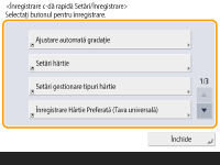 Dacă <Scurtătură Setări/Înreg.> nu se afișează pe ecranul <Acasă>, apăsați  <Setări Gestionare Acasă> <Restricţionare afişare funcţie> <Setare> setați să se afișeze <Scurtătură Setări/Înreg.>.