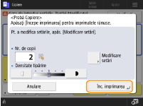 Apăsaţi <Începe imprimarea> pentru a imprima numărul de copii specificat. Dacă la pasul 5 aţi selectat <Toate paginile>, este imprimat numărul de copii minus unu. Dacă la pasul 5 aţi selectat <Pagini specificate>, este imprimat numărul total de copii.