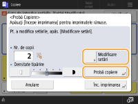 Apăsaţi <Modificare setări> pentru a modifica setările. După modificarea setărilor se afişează <Probă copiere>. Copiaţi din nou o probă.