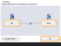 Setați claritatea pe <Mare> atunci când doriți să copiați documente originale care conțin text sau linii fine. Setați claritatea pe <Mic> atunci când doriți să copiați documente originale care conțin fotografii imprimate sau alte autotipii.