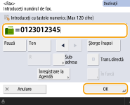Pentru a transmite faxuri internaţionalIntroduceţi numărul de acces internaţional, codul de ţară şi numărul faxului în această ordine. Dacă nu vă puteţi conecta cu succes la destinaţia internaţională, apăsaţi <Pauză> pentru a insera o pauză între un număr şi următorul număr.