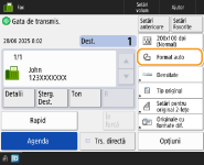 Când apare o eroare de transmisie, deoarece linia destinatarului este ocupatăAparatul reapelează automat după o anumită perioadă de timp. Puteţi modifica setările precum de câte ori să reapeleze aparatul şi intervalul dintre reapelări. <Reapelare Auto>