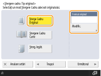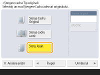Dacă dimensiunea afişată la <Format Original> este diferită de dimensiunea originalului, apăsaţi <Modificare> pentru a selecta dimensiunea. Puteţi seta modul Ştergere Cadru Original numai pentru dimensiunile de original indicate pe afişajul panoului tactil.
