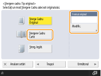 Dacă dimensiunea afişată la <Format Original> este diferită de dimensiunea cărţii, apăsaţi <Modificare> pentru a selecta dimensiunea. Puteţi seta modul Ştergere Cadru Carte numai pentru dimensiunile de original indicate pe afişajul panoului tactil.