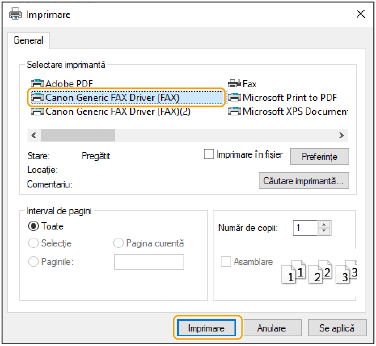 Selectaţi aparatul şi faceţi clic pe [Print] sau pe [OK].