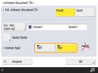 Apăsați  (Setări/Înregistr.)  <Setări funcţie> <Transmitere> <Setări Comune>  <Arhivare Document TX>.