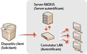Dacă un dispozitiv încearcă să se conecteze și să înceapă să comunice pe o rețea 802.1X, dispozitivul trebuie să treacă prin autentificarea utilizatorului pentru a demonstra că acea conexiune este realizată de un utilizator autorizat. Informațiile de autentificare sunt trimise către și verificate de un server RADIUS, care permite sau respinge comunicarea cu rețeaua în funcție de rezultatele autentificării. Dacă autentificarea eșuează, un switch LAN (sau un punct de acces) blochează accesul din exterior la rețea. Aparatul se poate conecta la o rețea 802.1X ca un dispozitiv client. Configurarea setărilor pentru autentificarea IEEE 802.1X