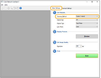 Puteți să specificați culoarea, rezoluția și dimensiunea originalului pentru scanare. Făcând clic pe fila [Advanced Settings] aveți permisiunea să efectuați setări detaliate precum orientarea originalului. Pentru mai multe informații, consultați Ajutorul pentru Color Network ScanGear 2.