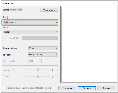 Dacă scanați întotdeauna cu aceleași setări, urmați procedurile de mai jos pentru a înregistra setările. Le puteți prelua cu ușurință și convenabil când scanați. Selectați [Adăugare profil] din lista verticală [Profil]  Specificați setările de scanare pe care doriți să le înregistrați  Introduceți un nume în caseta text [Nume profil]  Faceți clic pe [Salvare profil]