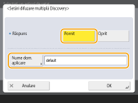 Apăsați <Preferinţe> <Reţea> <Setări TCP/IP> <Setări difuzare multiplă Discovery>.