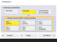 Autentificarea se poate face mai sigur prin codificarea schimbului de date. Când această măsură este folosită, informațiile despre versiunea LDAP și codul de caractere sunt setate la <ver.3(UTF-8)>. Ora aparatului și a serverului LDAP trebuie să fie sincronizate.