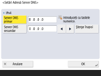 Apăsați <Preferinţe>  <Reţea>  <Setări linie secundară>  <Setări pentru Comunicare date sistem>  <Setări Adresă Server DNS>.