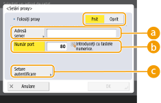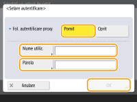 Apăsați această opțiune pentru a seta informațiile de autentificare când utilizați funcția de autentificare a unui server proxy. Apăsați <Pornit> pe ecranul afișat, introduceți numele de utilizator și parola pentru autentificarea serverului proxy, apoi apăsați <OK>.