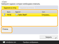 (Стоп) на панели управления, пока обрабатывается задание отправки/факса и отображается экран <Факс>/<Сканировать и отправить>, появится всплывающий экран, который напрямую отменяет текущее задание. Когда выполняется несколько заданий, можно выбрать, какое задание следует отменить: последнее выполненное или отправляемое в данный момент. (<Задание, отменяемое при нажатии клавиши Стоп>)Если имеется задание, начатое после нажатия