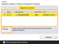 (Стоп) на панели управления, когда обрабатывается задание отправки/печати и отображается экран, ведущий к <Задания на отпр.>/<Задания на печать>, текущее задание отправки/печати приостанавливается и появляется <Задания на отпр.>/<Задания на печать>.