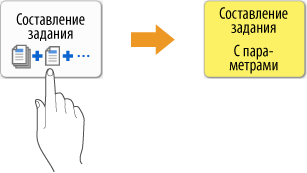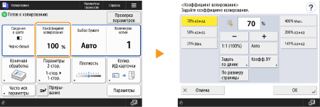 Отображает состояние параметров, таких как масштабирование при копировании, бумага для копирования и количество копий. Если требуется изменить параметр, выберите необходимый элемент параметра.