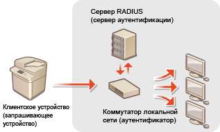 При подключении к сети стандарта 802.1X и взаимодействии в ней устройство должно пройти аутентификацию пользователя для подтверждения того, что подключение установлено авторизованным пользователем. Данные аутентификации передаются на сервер RADIUS для проверки. В зависимости от результатов этой проверки устройство может или не может быть подключено к сети. Если аутентификация не пройдена, коммутатор локальной сети (или точки доступа) блокирует доступ извне. Аппарат подключается к сети 802.1X в качестве клиентского устройства.
