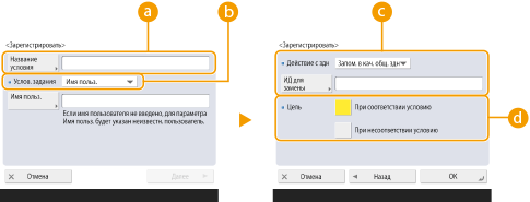 Выберите способ обработки документов, соответствующих заданным условиям. При выборе <Запом. в кач. общ. здн> можно включить функцию <ИД для замены>, чтобы указывать имя пользователя в журнале при печати. Чтобы прекратить работу с документом, выберите <Отмена>.