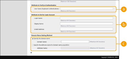Выберите способ задания имени домена местоположения для входа. Чтобы указать имя домена вручную, установите переключатель [Укажите имя домена] и введите имя домена. Чтобы указать поле данных LDAP (имя атрибута), из которого следует получить имя домена на сервере LDAP, установите переключатель [Укажите имя атрибута для получения имени домена] и введите имя атрибута (Example: dc).