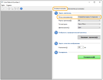 В раскрывающемся списке [Метод сканирования] на вкладке [Основные настройки] выберите способ загрузки оригинала.