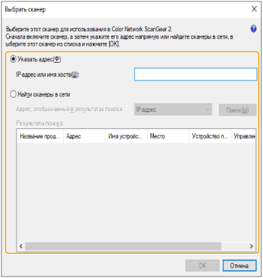 Установите переключатель [Указать адрес] и введите в поле [IP-адрес или имя хоста] соответствующие сведения.