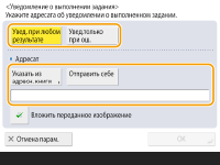 Аппарат можно настроить таким образом, чтобы по окончании отправки или сохранения документов пользователю отправлялось соответствующее уведомление по электронной почте. Даже если документы ожидают отправки, для проверки состояния отправки или сохранения документов можно воспользоваться компьютером или портативным устройством. При возникновении ошибки пользователю отправляется сообщение электронной почты со списком адресатов, которым не удалось отправить документы (или сохранить их).