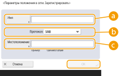 При выборе протокола <SMB> отображается поле <Местоположение>, а при выборе протокола <WebDAV> — поле <Имя хоста>.