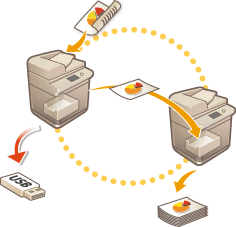 Документы, отсканированные на вашем аппарате, можно сохранить в разделе Супер-ячейка другого многофункционального аппарата Canon. Кроме того, файлы, хранящиеся в разделах Супер-ячейка других аппаратов, можно напечатать или удалить с вашего аппарата. Кроме того, к аппарату можно подключить запоминающее устройство и использовать его в качестве внешнего хранилища. Выберите наиболее подходящее для себя хранилище, соответствующее вашим потребностям.
