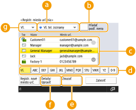 Vyberte alfanumerické tlačidlo s prvým znakom názvu miesta určenia. Stlačením tlačidla <Vš.> zobrazíte všetky uložené miesta určenia.