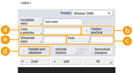 a heslo v poli . Bližšie informácie nájdete v časti <Inf. použité na VYS. súboru/overenie prechádz.>.Ak nastavíte položku <Protokol> na možnosť <Windows (SMB)> alebo <FTP>, v prípade špecifikovania priečinka, ktorý neexistuje v časti <Cesta k priečinku>, sa priečinok vytvorí automaticky a súbory sa uložia doň. Ak však špecifikujete priečinok s viacerými úrovňami, dôjde k chybe odosielania.