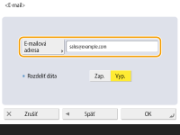 Ak vyberiete možnosť <Vyp.>, počet strán odosielaných súčasne sa zníži a celkový prenos sa rozdelí na niekoľko častí. Napríklad 10 strán údajov sa prenesie na dvakrát, zakaždým po 5 strán. Komunikačný partner na druhej strane teda prijme dva e-maily. Ak však odosielate údaje, ktoré nemožno rozdeliť na strany, napríklad súbory JPEG, vyskytne sa chyba prenosu.
