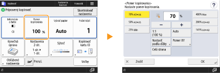 Zobrazí sa stav nastavenia, napríklad pomer kopírovania, kopírovací papier a počet kópií. Keď chcete zmeniť nejaké nastavenie, vyberte požadovanú položku nastavenia.