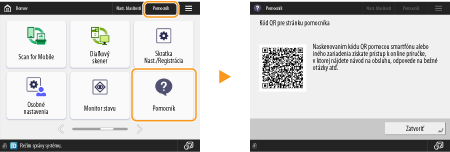 Po stlačení tlačidla <Pomocník> sa zobrazí kód QR. Naskenovaním tohto kódu QR pomocou mobilného zariadenia, napríklad smartfónu alebo tabletu, získate prístup na stránku Užívateľská príručka pre toto zariadenie.