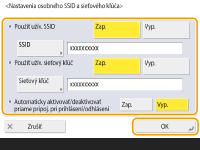 Stlačte tlačidlo <Nastavenia osobného SSID a sieťového kľúča>, špecifikujte osobný identifikátor SSID a sieťový kľúč, a stlačte tlačidlo <OK>.