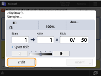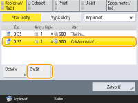 (Stop) na ovládacom paneli, keď sa zobrazuje obrazovka základných funkcií kopírovania, úloha kopírovania sa pozastaví a zobrazí sa hlásenie <StopVyberte kopír. úlohu, ktorú chcete zrušiť.> a zoznam úloh kopírovania. Môžete vybrať úlohu kopírovania zo zoznamu a zrušiť ju stlačením tlačidla <Zrušiť>.Ak sa prihlásite so správou osobného overovania a odhlásite sa po stlačení tlačidla