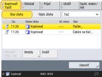 (Stop) na ovládacom paneli, keď úlohy kopírovania čakajú na vykonanie, všetky úlohy kopírovania sa pozastavia a zobrazí sa správa <StopVyberte kopír. úlohu, ktorú chcete zrušiť.> a zoznam úloh kopírovania. Môžete vybrať úlohu kopírovania zo zoznamu a stlačením tlačidla <Zrušiť> môžete danú úlohu kopírovania zrušiť. Ak chcete obnoviť kopírovanie, stlačte tlačidlo <Obnoviť kopírov.>. |