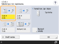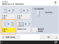 Keď sa zobrazuje obrazovka výberu veľkosti origináluAk je položka <Vybrať papier> nastavená na možnosť <Auto>, môže sa zobraziť obrazovka výberu veľkosti originálu. Zobrazuje sa, pretože v prípade vloženia priehľadných dokumentov, originálov s mimoriadne tmavou základnou farbou alebo originálov v malom formáte, nie je možné overiť originál a papier nie je možné zvoliť automaticky. Vyberte formát originálu alebo formát, ktorý je mu najbližšie.