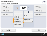 Ak nastavíte možnosť <Auto>, formát papiera budete musieť vybrať ručne. Ak nezvolíte formát papiera, nastaví sa pomer kopírovania automaticky tak, aby súhlasil s formátom papiera vloženého v zásuvke na papier 1.
